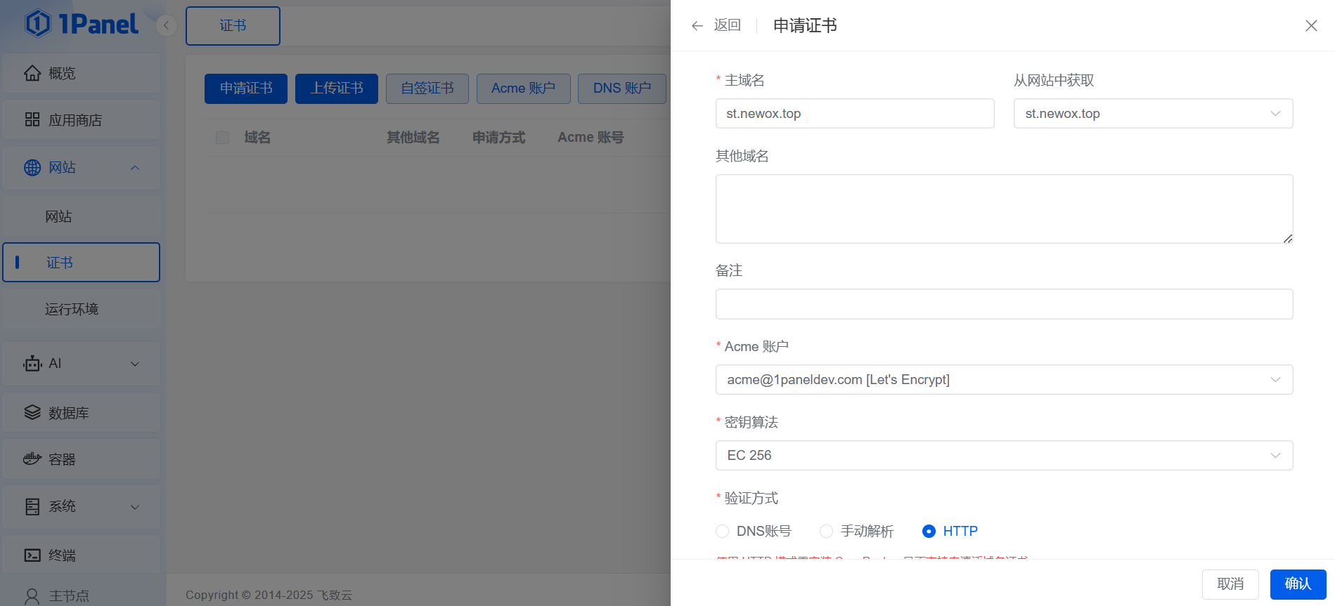 这时,我们已经可以通过域名访问了,但是浏览器会提示网站不安全,下一步需要点击左侧证书-申请证书,然后在右侧获取网址,选择Acme账户,验证方式可以选择HTTP(我嫌费事就没选DNS账号),点击确认,稍等一会就可以看到证书申请成功了