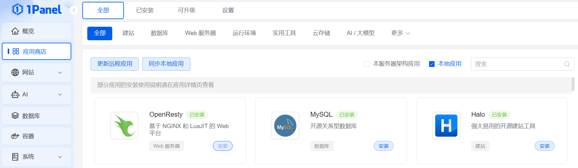 登录1panel控制面板后,点击左侧应用商店,就能看到置顶的三个应用,这就是我们建站需要的三大金刚