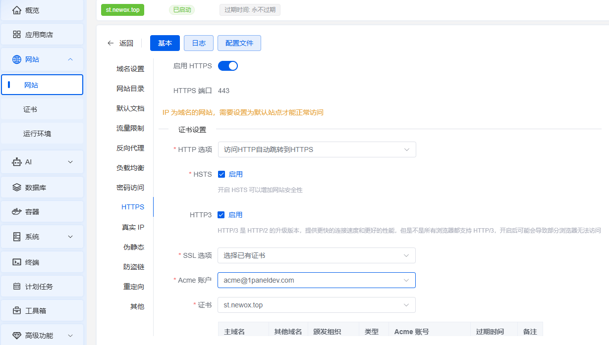 这时,我们已经可以通过域名访问了,但是浏览器会提示网站不安全,下一步需要点击左侧证书-申请证书,然后在右侧获取网址,选择Acme账户,验证方式可以选择HTTP(我嫌费事就没选DNS账号),点击确认,稍等一会就可以看到证书申请成功了